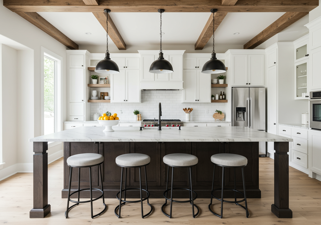 This style of decorating is defined by a neutral palette that allows accessories to really pop, wood paneling, and antique furniture that makes the home look elegant yet homey. Light brown fabric for the antique furniture will match the wood paneling in a way that looks warm and cozy. Maybe there’s a red quilted blanket folded over the back of the couch inviting you to curl up with a book and read as you glance out the window and watch the snow float past a streetlight.